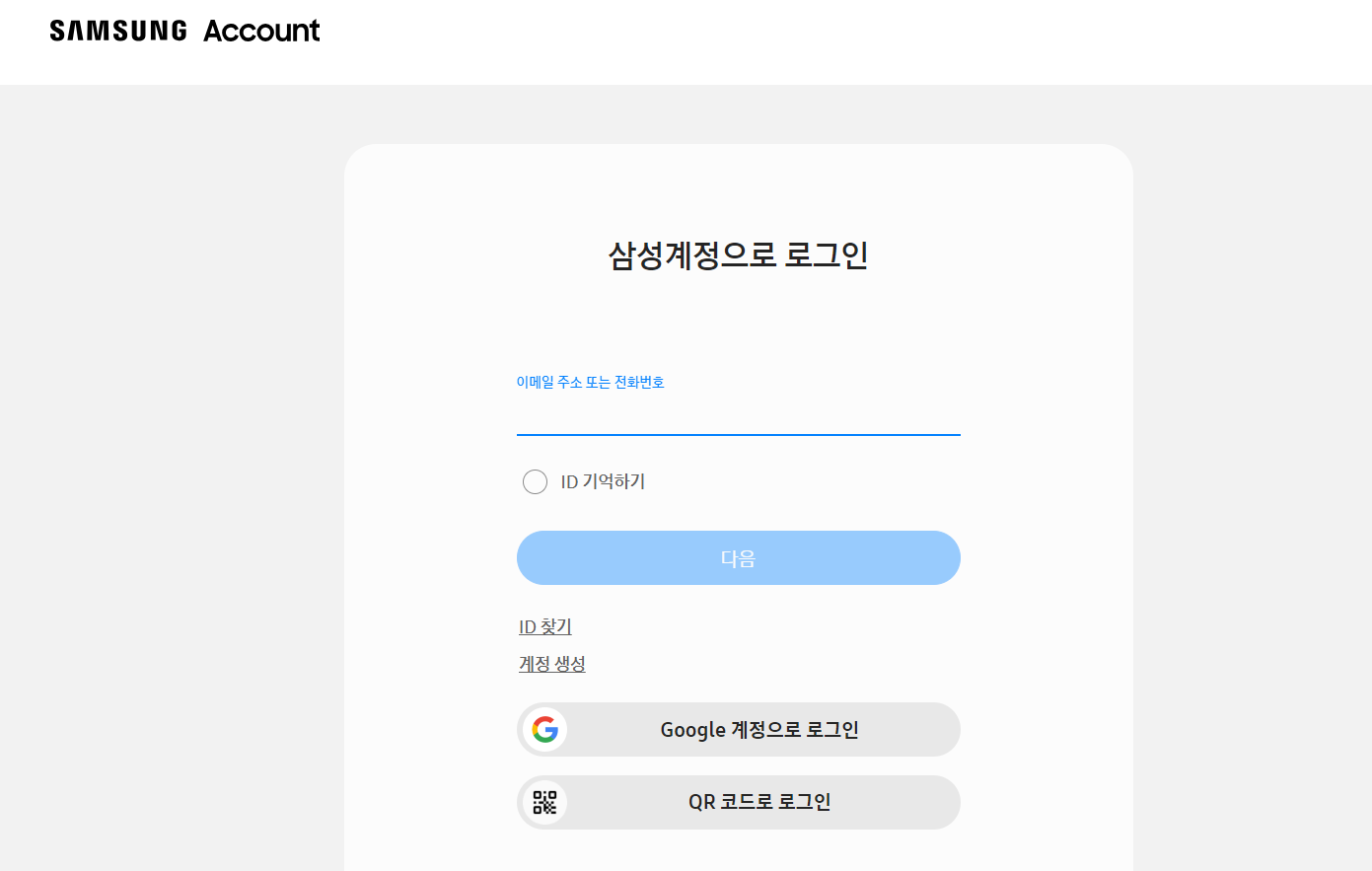 4. 삼성 계정 로그인 창이 나오면, 스마트싱스를 연결한 삼성계정으로 로그인 한다. (로그인 되어있을 경우 생략)