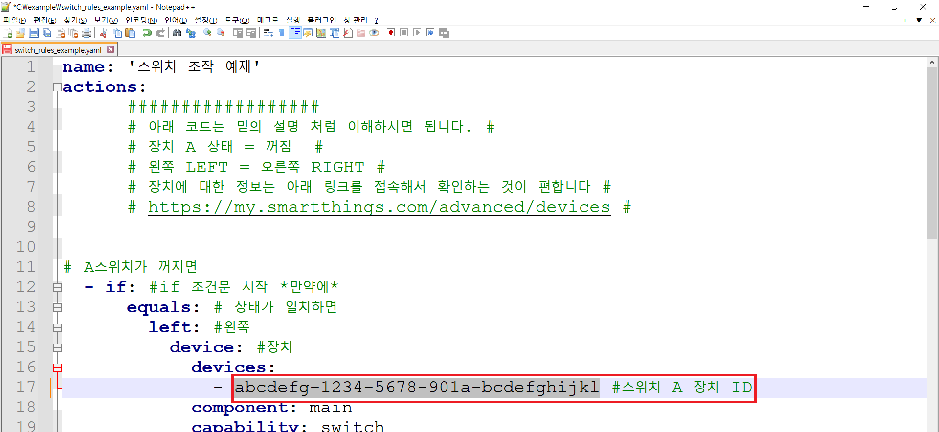 이 장치 ID를 복사하셔서 예제 파일의 스위치 A 장치 ID에 입력하시면 됩니다.